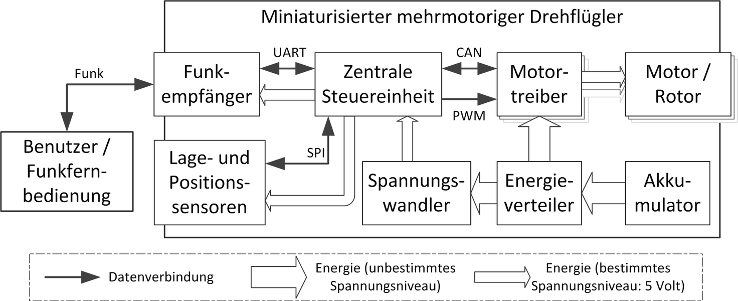 Um den Anforderungen gerecht zu werden und eine hohe Flexibiltät zu erreichen, ist eine modulare Lösung vorgesehen. Durch echtzeitfähige Systeme, Datenbussysteme und komplexe Steuerungsalgorithmen soll eine äußerst ruhige Lage des Fluggeräts erreicht werden. Mit Hinblick auf Sicherheit werden die Module einzeln und im Zusammenwirken betrachtet. Abbildung 1 stellt die grobe Struktur des Fluggeräts dar.